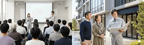 住民説明会の資料作成や案内、出欠票の管理など事務局業務をすべて代行。専門家として中立的に説明を行い、理事会様の負担を軽減しながら円滑な総会決議を伴走支援します。