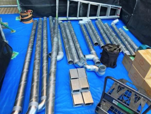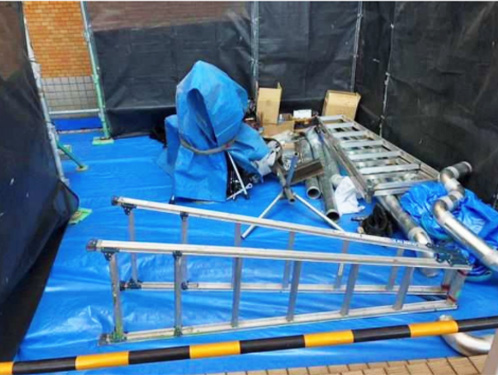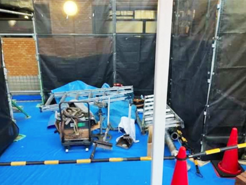 資材は必要分のみを整理して保管し、通行の妨げとならない環境を整えたうえで施工を開始していきます。