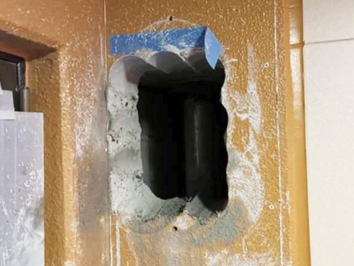 配管貫通部にはロックウール充填やモルタル復旧を行い、防火区画の性能を確保しました。