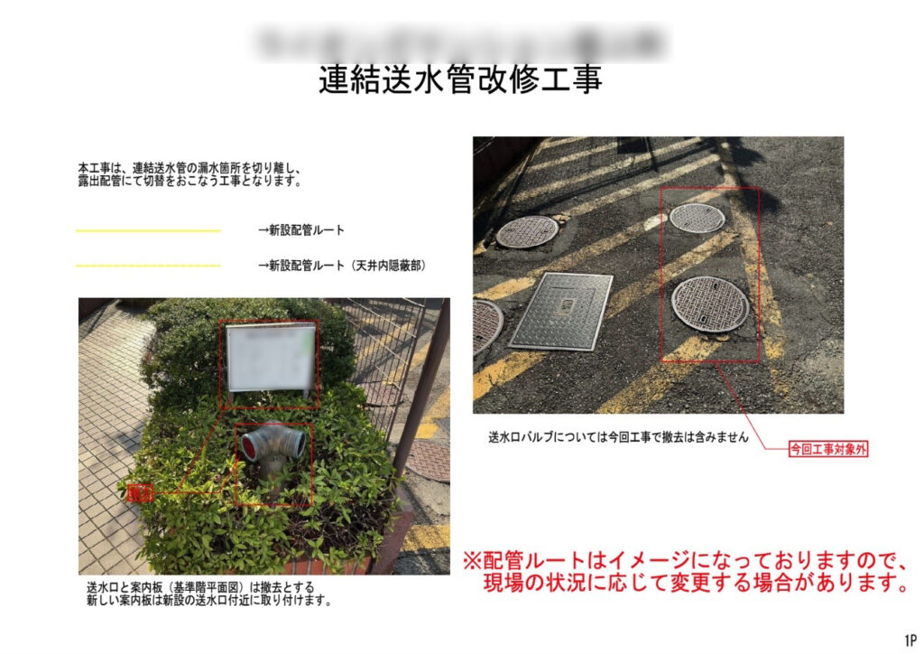 連結送水管の漏水状況や既存配管ルートを正確に把握するため、着工前に現地調査を実施し、建物や外構への影響を抑えた新設ルートを計画しました。その内容をもとに理事会様・管理会社様と連携し住民説明会を開催。工事範囲や施工方法、作業時間帯、騒音・安全対策など、生活に関わる事項を資料を用いて分かりやすくご説明しました。