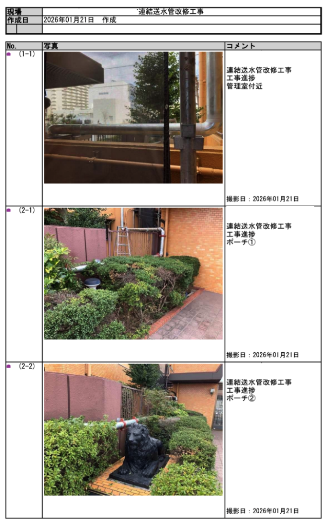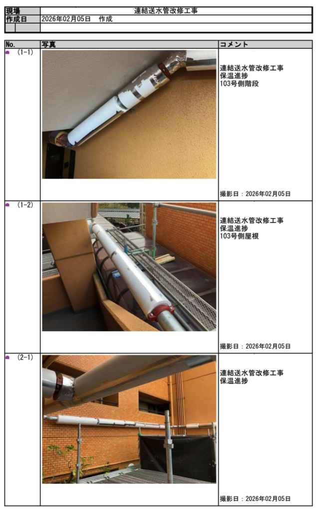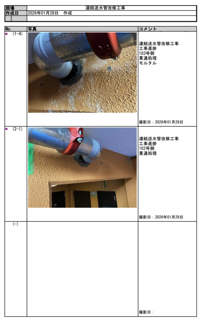 工事完了後には、施工状況を写真とともにまとめた「工事報告書」を作成し、管理組合様へ提出しています。配管更新の施工状況や接続部、貫通部処理、各工程の進捗など、完成後には確認が難しくなる部分も含めて記録として残しました。