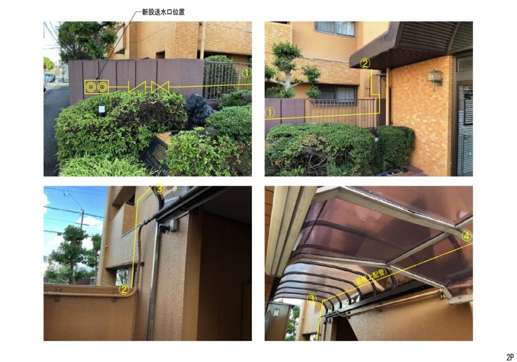 設備接続ポイント確認|管理室付近・ポーチ・送水口